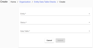 Navigate to the Entity Data Table Checks page and then click the +Create Entity Data-Table Check button which will launch a pop-up box. Look through the previous section of this page to get details on how to navigate to the page.