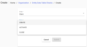 Entity Data Table Check is a new feature added to check few Custom details during certain actions that need to be done by making use of Custom Data Tables. For instance you need to check the existing Bank Account of the client before the creation of client. Then you can create your own Custom Data Table with column Existing Bank Account and check the details before the creation of client.