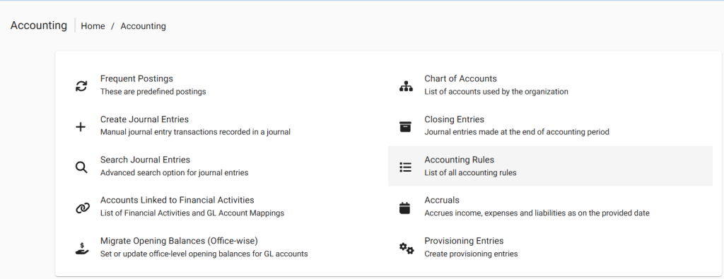 Accounting Rules are preconfigured accounting transactions in which debit and credit accounts available for posting are defined.