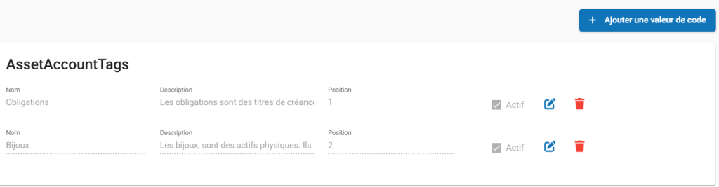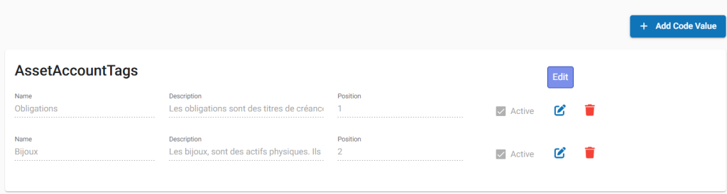 - In the Asset Account Tag dialog, click +Add Code Value at the top right corner of the window.