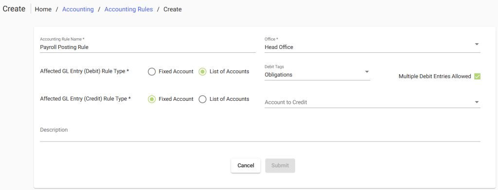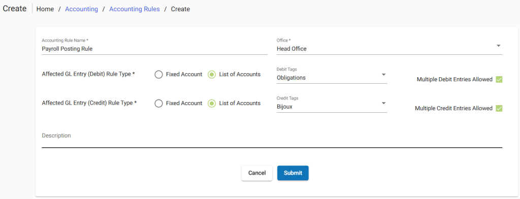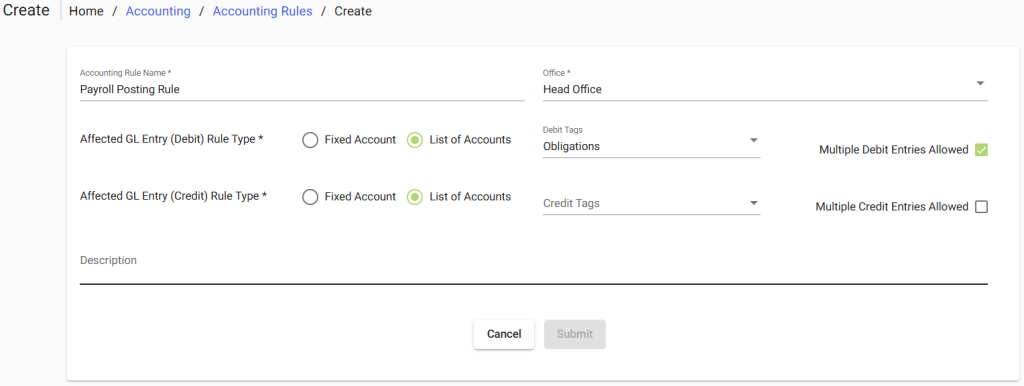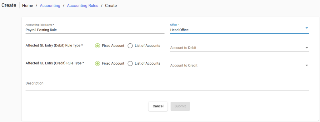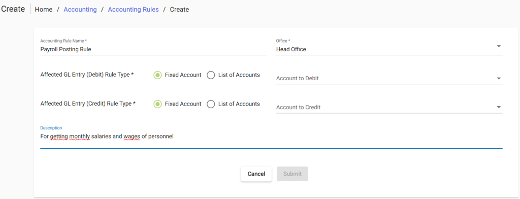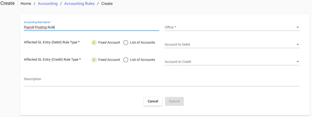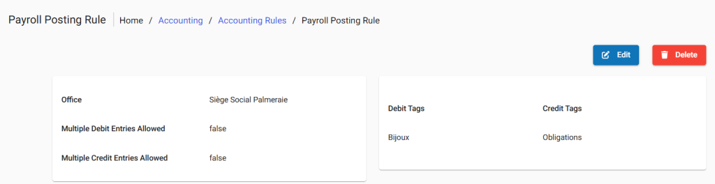 For example, you can configure an Accounting Rule for a payroll that will display only the expense accounts related to payroll debits and only the asset accounts available for credits.