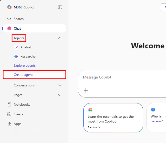 If you don’t see the Create an agent option and you have a Microsoft 365 Copilot license or a Copilot Studio Pay-As-You-Go plan, check with your organization’s administrator to see if they can enable this feature in the Microsoft 365 Admin Center by assigning you a role that allows agent creation.
