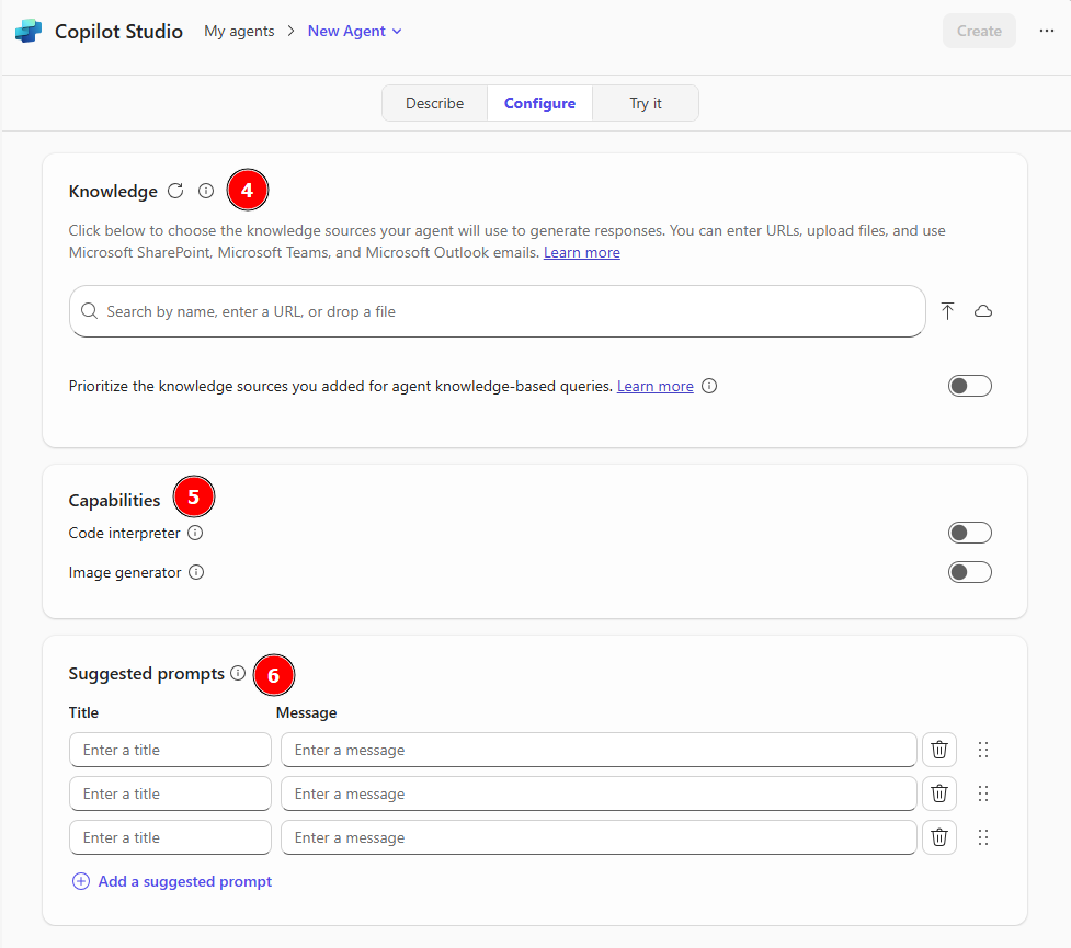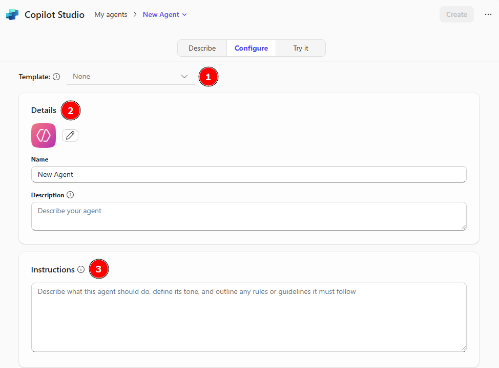 After selecting Create an agent, a window opens in Copilot Studio. The Describe window is the homepage for defining and creating a new agent in Copilot Chat. Here are the available options when creating an agent via the Describe screen:
