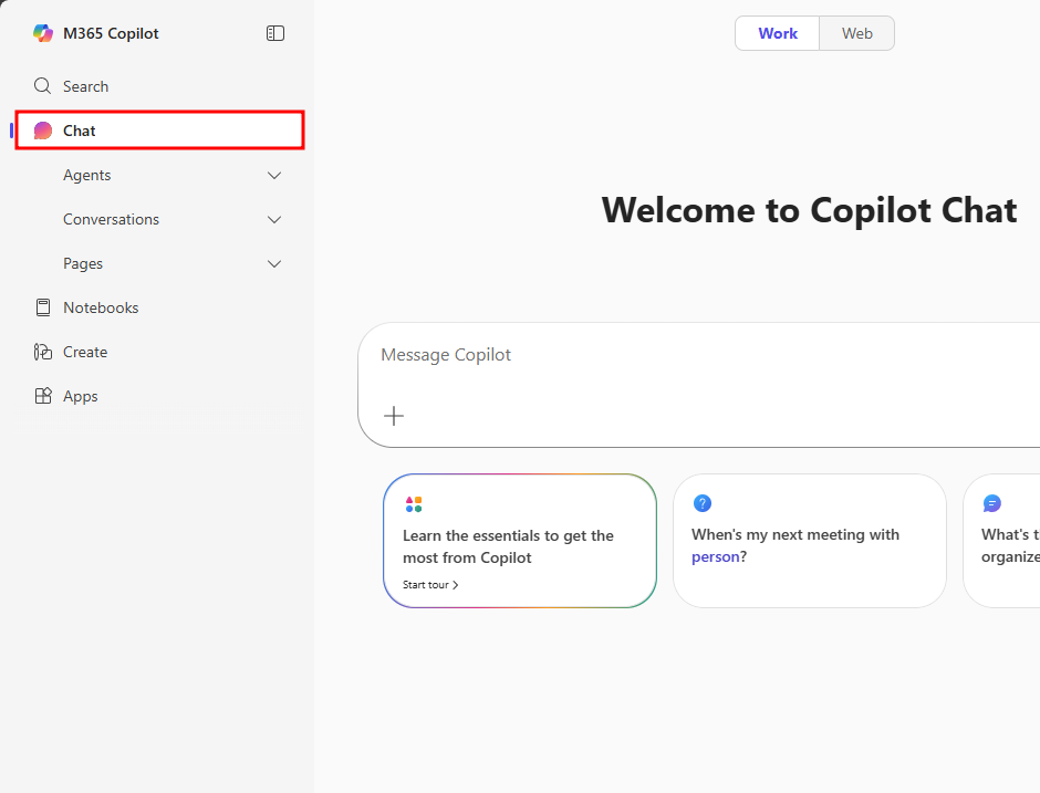 - Chat – The main page of Copilot Chat. Selecting this opens the base Copilot Chat agent, which has access to your Microsoft 365 data. This agent is ideal for topics requiring web search and includes Microsoft 365 Copilot’s pretrained data. The Chat tab also includes three sub-levels: