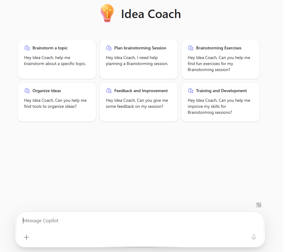 The preconfigured Idea Coach agent in Microsoft 365 Copilot helps you think through your ideas, develop them, and strengthen them. Whether you’re refining a proposal, exploring a new concept, or seeking feedback before sharing your thoughts, Idea Coach acts as an intelligent conversation partner.