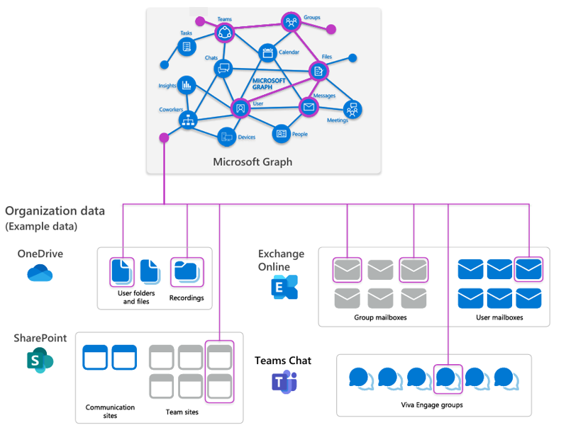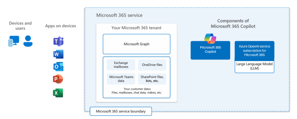 Graph agrège les données provenant des services Microsoft 365 tels que Exchange Online, SharePoint, OneDrive et Teams. Ainsi, les courriels, calendriers, documents, transcriptions de discussions et notes de réunion sont tous accessibles via une seule couche d’API. Par exemple, si un utilisateur demande à Copilot de rédiger un rapport trimestriel d’activité, Graph peut extraire des courriels depuis Exchange, des feuilles de calcul financières depuis OneDrive, et des rapports d’état depuis Teams, fournissant ainsi au LLM un ensemble de données complet.