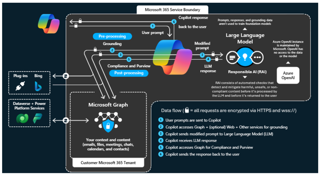 Tout au long de ce processus, les données sont chiffrées pendant leur transit, et seules les informations que l’utilisateur est autorisé à consulter sont utilisées. Copilot ne stocke pas les données ni ne les utilise pour entraîner le modèle de langage étendu (LLM).