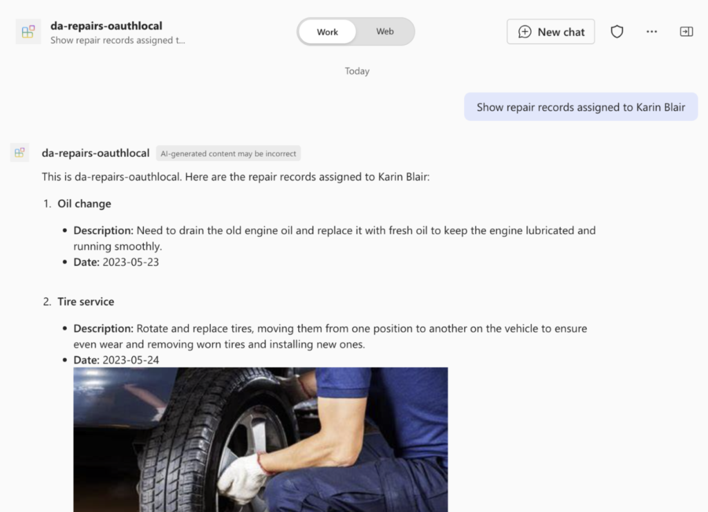 Suppose you work in an auto repair shop. Your organization tracks various repair requests using a specialized system. You and your colleagues regularly consult information about different repairs. The current system offers a rudimentary search feature that only finds repairs matching specific keywords. You would like to have an AI-powered assistant capable of answering questions about repairs asked in natural language. There is an API secured by an API key that exposes repair information, which you could connect to. The information changes regularly, so the assistant should query it in real time.