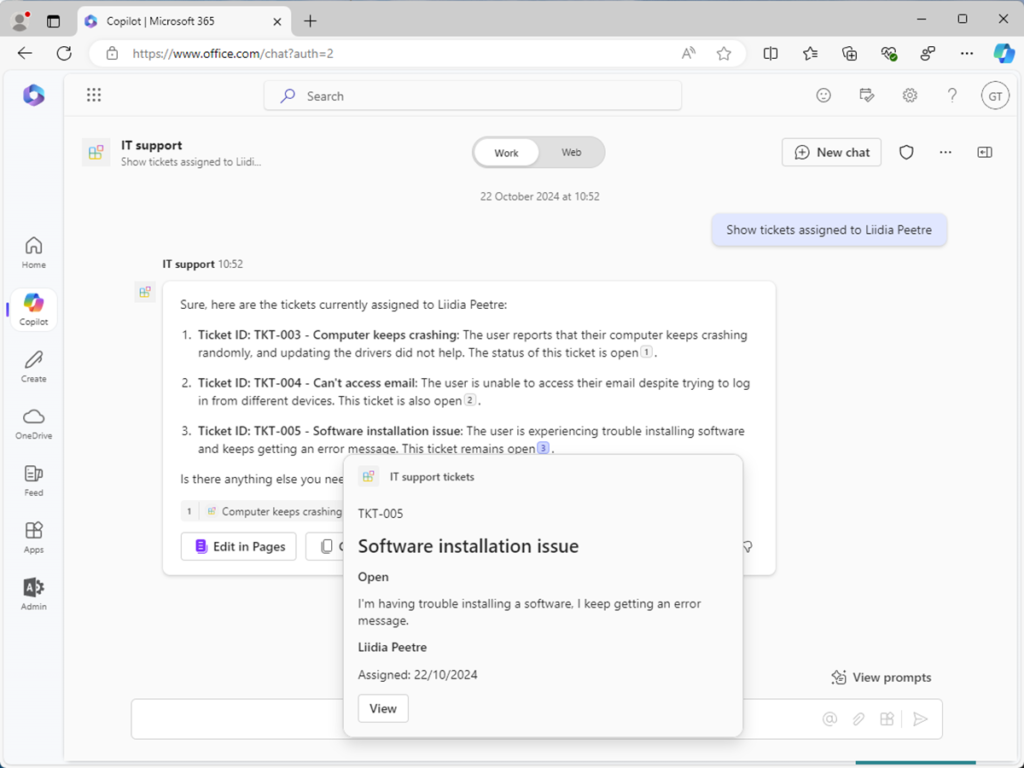 Let’s see how custom knowledge and custom actions are used together in a declarative agent to solve our IT support problem.