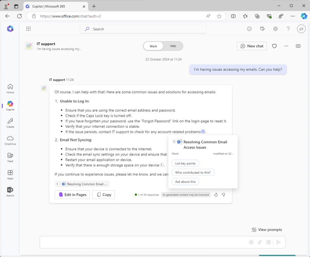 Example: In our IT support scenario, a SharePoint Online document library is used as the grounding data source.
