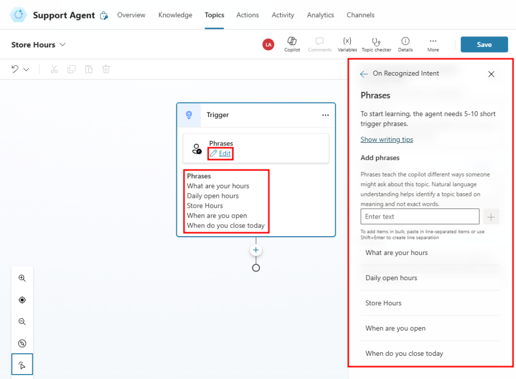 Each topic you define must include trigger phrases. Trigger phrases are examples of text such as questions or statements that teach the agent when to respond with this dialogue. For example, the following image contains a topic called Store opening hours, which is used to provide customers with store hours based on different scenarios.