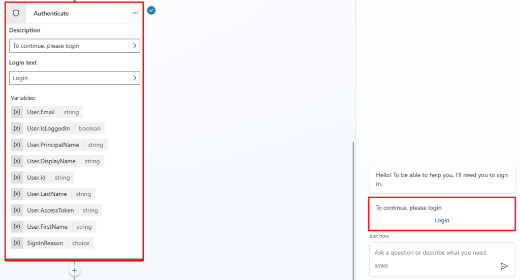 You can call the Authenticate action during a conversation, which prompts the user with a sign-in card. Alternatively, you can select the option Require users to sign in, which creates a system topic called Require user sign-in. This prompts the user to sign in as soon as they start the conversation with the agent.