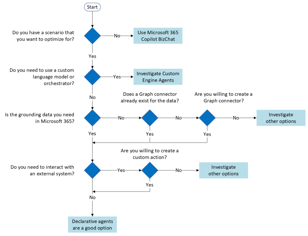 The following diagram summarizes the key questions to ask when considering using declarative agents.