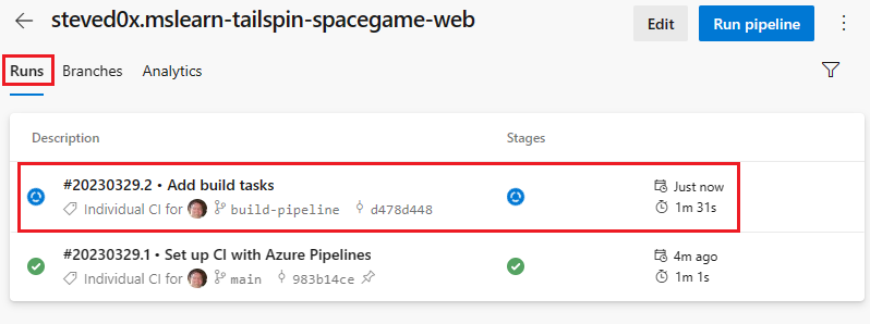 branch, to GitHub.Pushing the branch to GitHub triggers the build process in Azure Pipelines. - In Azure Pipelines, go to your build. To do so, on the side of the page, select Pipelines, then select your pipeline. You’ll see your commit message and that the build is running using the code from the