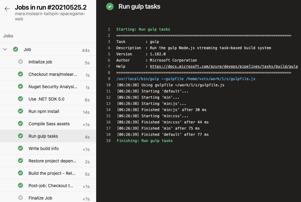 In practice, you might add build tasks one at a time, push your changes, and watch the build run. Here, you’ll add all the build tasks we identified earlier at one time.