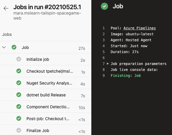 Under Jobs, select Job. Next, trace the build process through each of the steps. To see the job output as a text file when the build completes, you can also select View raw log.