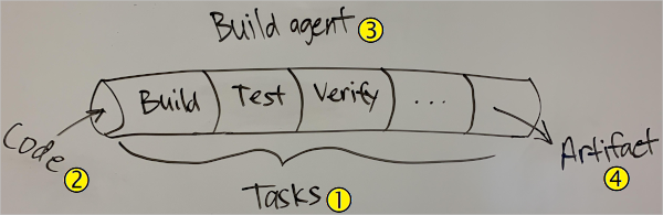 A pipeline defines the continuous integration process for the app. It’s made up of steps called tasks . You can think of it as a script that defines how your build, test, and deployment steps are run. I’m going to try to map our scripts to tasks.