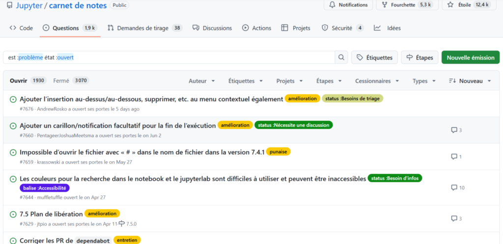 /issuesto the end of the URL, for example:https://github.com/jupyter/notebook/issues - Pull requests: This is where users discuss and review changes made to the project. You can access it by adding