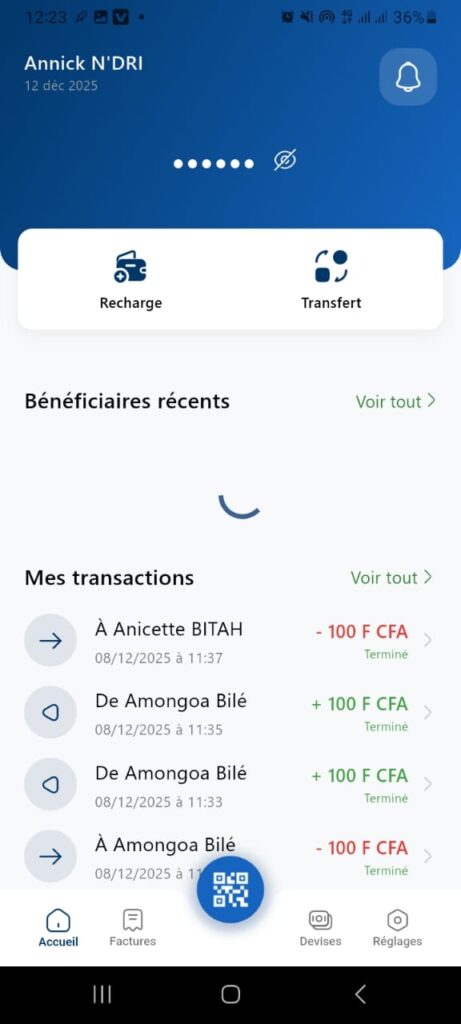 Example: To Sidibé Rita -100 F CFA Completed (12/08/2025 at 11:37).