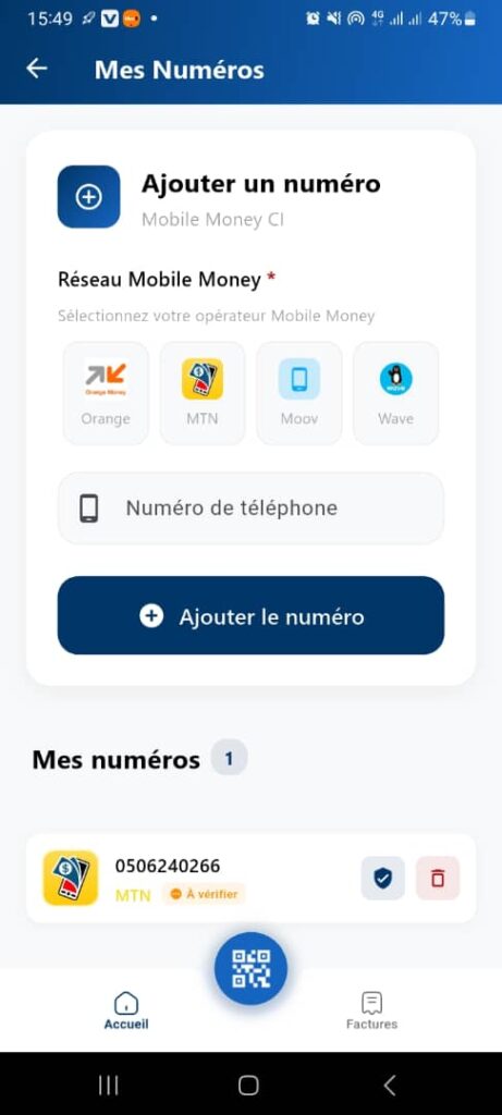 This page is used to manage multiple Mobile Money numbers for operations (payment, top‑up, transfer…).