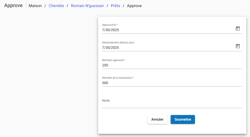 Dans la capture d’écran ci-dessous, un exemple de modification du montant du prêt au moment de l’approbation du prêt est présenté.