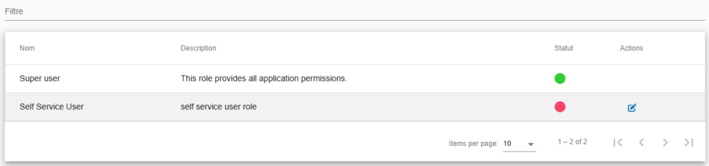 Identifiant utilisateur, Nom d’utilisateur, Bureau, Statut, Langue, Adresse e-mail principale, Rôle et Permission de visualisation.