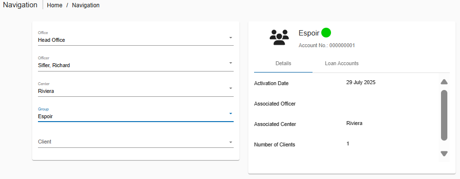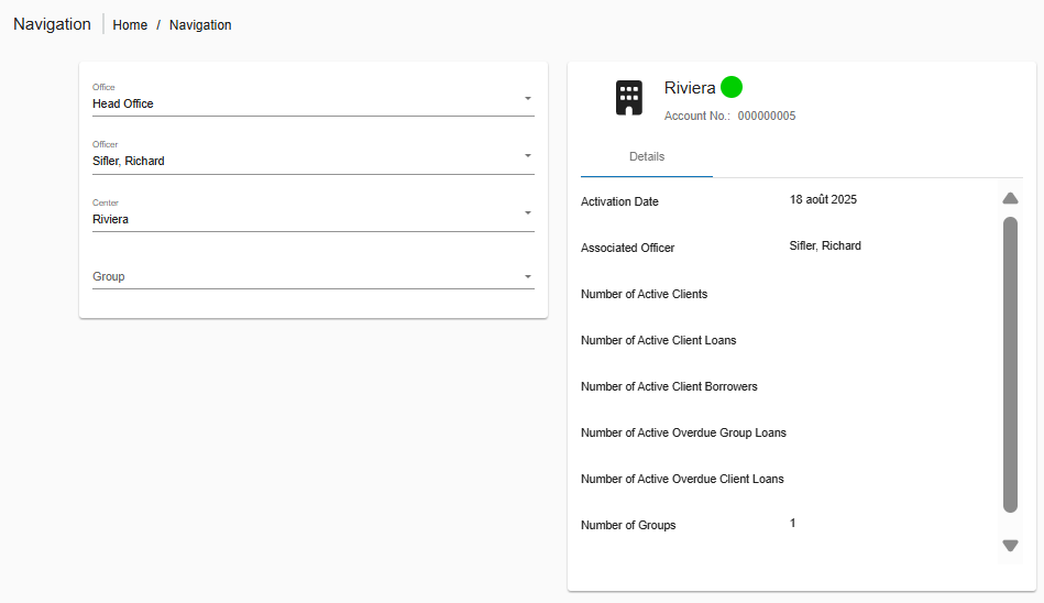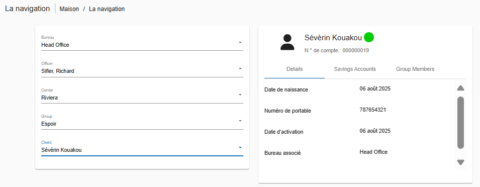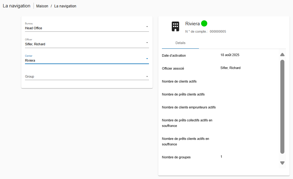 L’outil de navigation vous permet de parcourir rapidement les agences, agents de crédit, centres, groupes et clients dans Phenix. Il offre un mécanisme très efficace qui vous permet de filtrer rapidement et d’accéder à des groupes ou clients spécifiques sous une agence donnée.