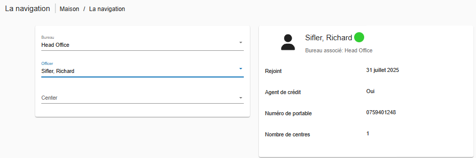 Comme illustré dans la capture d’écran ci-dessous, un centre est géré par l’agent de crédit sélectionné (Siffer, Richard).
