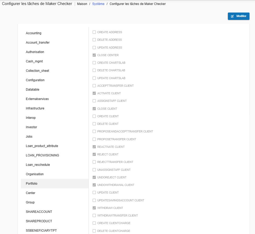 Les tâches actuellement activées pour Maker-Checker sont signalées par une coche dans la case située à leur droite.