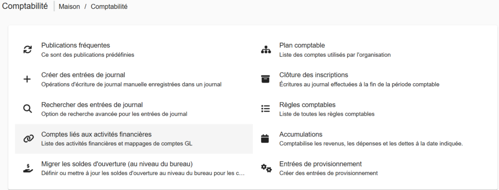 - Le menu Comptabilité s’ouvre. Sélectionnez Comptes liés aux activités financières.