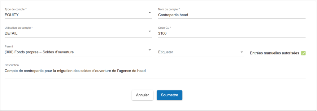 Créez un compte de contrepartie (par exemple : Compte de contrepartie des soldes d’ouverture, qui doit être un compte de type Capitaux propres).