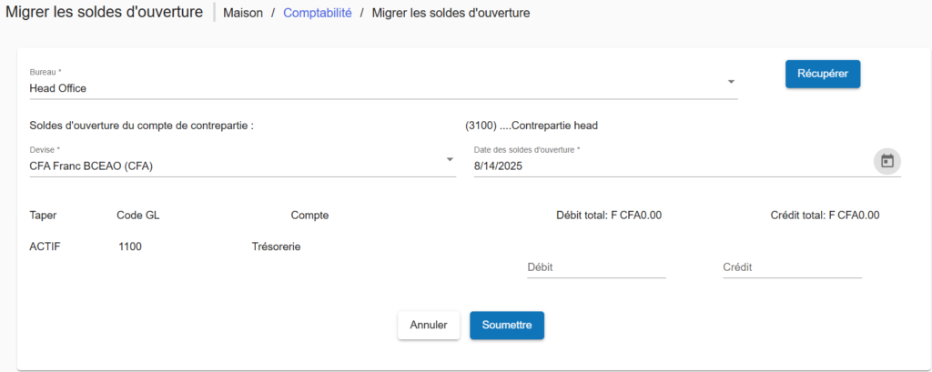 En tant que comptable principal, je souhaite définir les soldes d’ouverture des comptes du grand livre (GL) pour une agence spécifique ou pour l’ensemble de l’organisation.