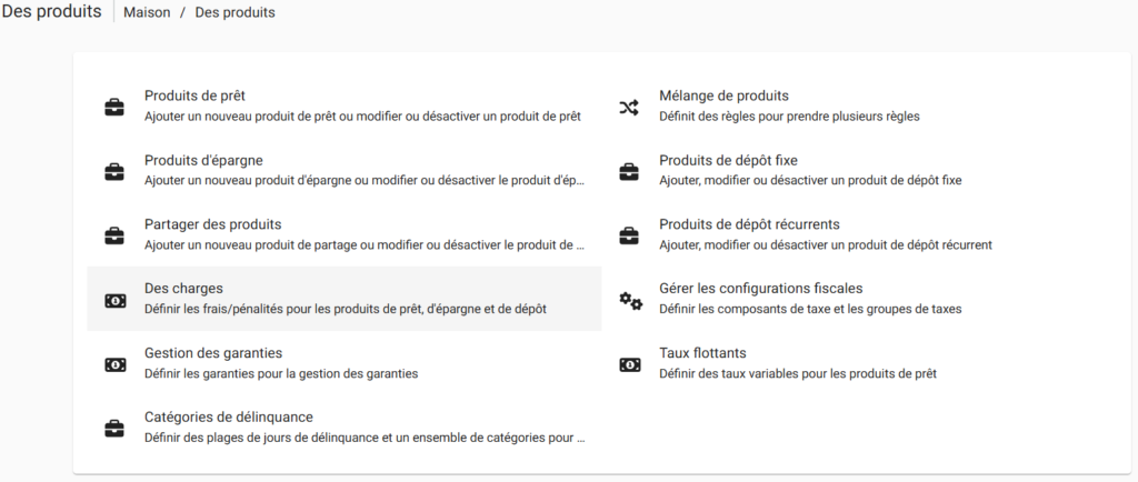 Les frais peuvent être associés à un produit. Lorsqu’un compte est ouvert à partir d’un produit auquel des frais sont associés, le compte inclura (héritera) automatiquement tous les frais liés à ce produit.