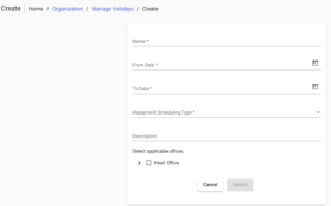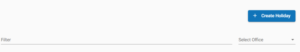 Cette option vous permet de créer de nouveaux jours fériés pour chaque bureau de votre organisation. Cliquez sur le bouton bleu Créer un congé en haut à droite de l’écran.