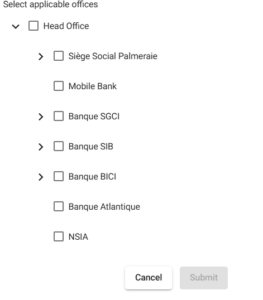 3. Sélectionnez le(s) bureau(x) concerné(s) par le congé en cliquant sur le petit icône ‘>’ à côté de Bureaux concernés. Cela ouvrira une liste de bureaux parmi lesquels vous pourrez choisir. Cochez les cases pour sélectionner les bureaux à inclure.
