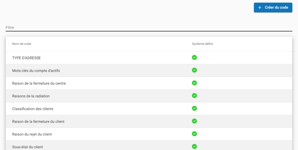 Une fois que vous avez cliqué sur le bouton Gérer les codes, l’application Phénix générera une liste de tous les codes disponibles dans le système Phénix pour votre organisation.