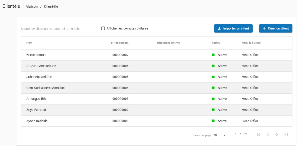 Une liste de clients s’affichera s’il y a eu des enregistrements, avec leurs nomsnuméros de compte (numéro client)statutsbureaux et personnel associé.