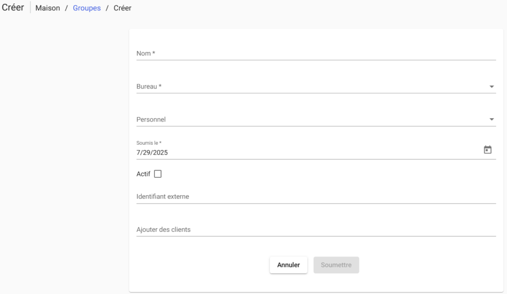 Bureau | Dans le menu déroulant, sélectionnez le bureau auquel appartiennent les clients afin de créer leur groupe. | — |