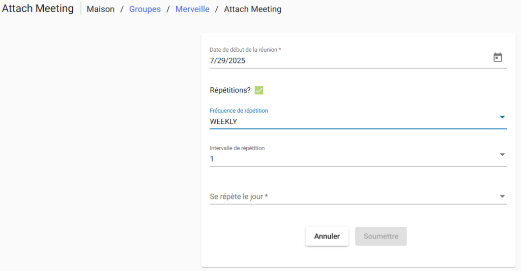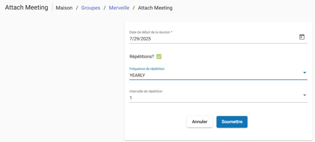 Une fois le groupe créé, l’étape suivante consiste à attribuer une date de réunion au groupe.