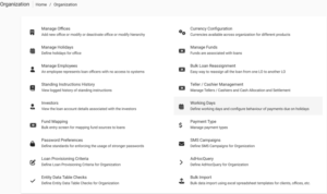 Depuis l’écran principal, sélectionnez Admin, puis Organisation dans le menu déroulant. Cela ouvrira le menu Organisation. Sélectionnez Jours ouvrables pour spécifier les jours de travail.