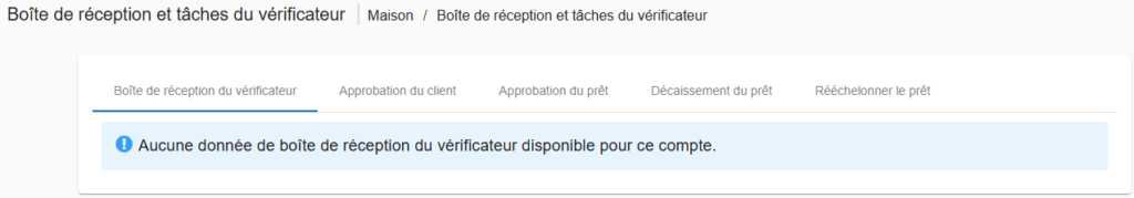 Une fois que vous avez cliqué dessus, la fenêtre suivante apparaîtra, affichant les tâches en attente dans la boîte de réception du vérificateur, ainsi que pour les clients et les prêts.