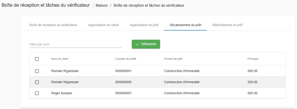 Ensuite, cliquez sur le bouton « Décaisser » afin de procéder simultanément au décaissement de plusieurs prêts.