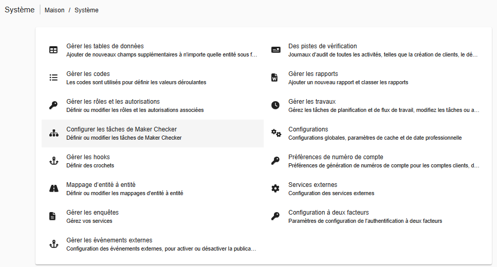 Cela ouvrira le menu Système. - Sélectionnez Configurer les tâches Maker-Checker.