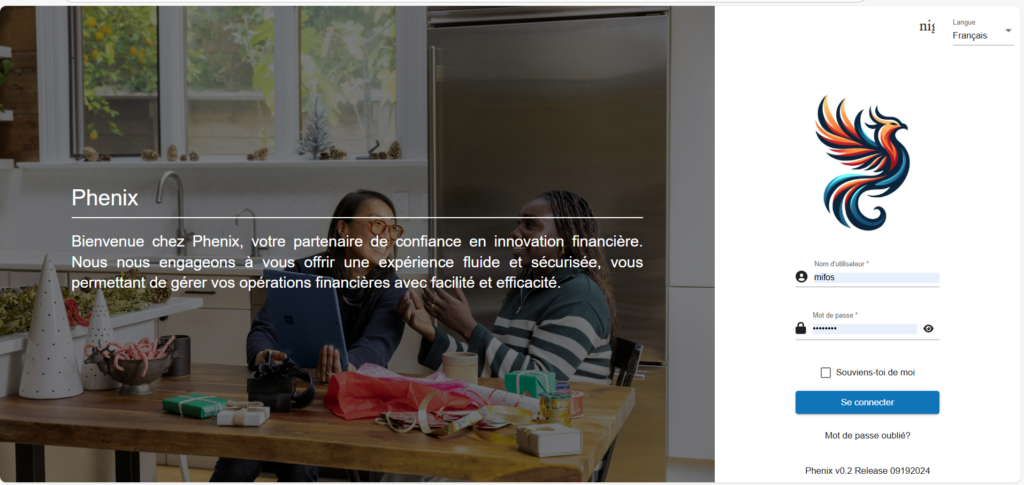 Votre administrateur système vous fournira votre nom d’utilisateur, votre mot de passe, ainsi que l’URL nécessaire pour accéder à l’instance de Phenix de votre institution financière.