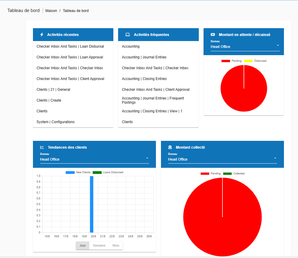 La page du tableau de bord s’affiche lorsque vous cliquez sur Tableau de bord depuis la page d’accueil.