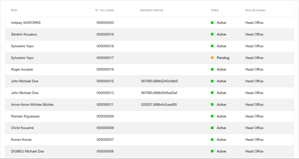 La recherche globale permet aux utilisateurs de rechercher des Clients, Groupes, Centres, Prêts et Dépôts en fournissant l’une des informations suivantes :