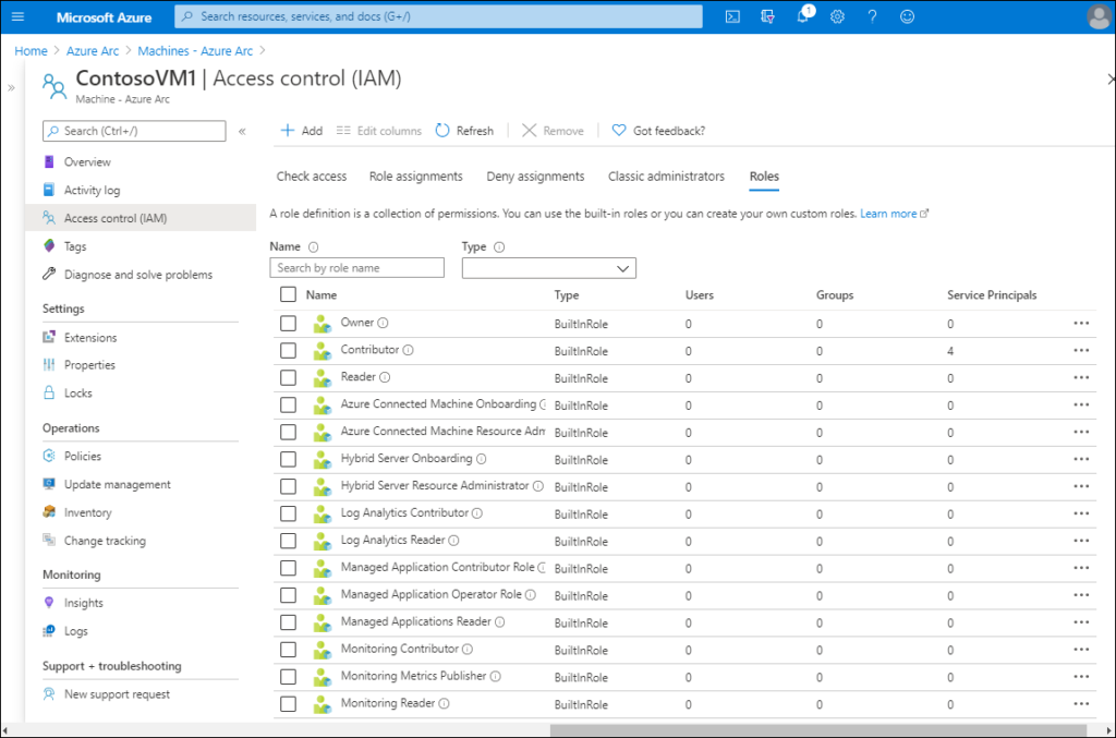 | Rôles | Dans l’onglet Rôles, vous pouvez affecter des comptes d’utilisateurs aux rôles intégrés. Vous ajoutez une affectation de rôle depuis la barre d’outils. En savoir plus : Ajouter ou supprimer des affectations de rôle Azure via le portail Azure. |