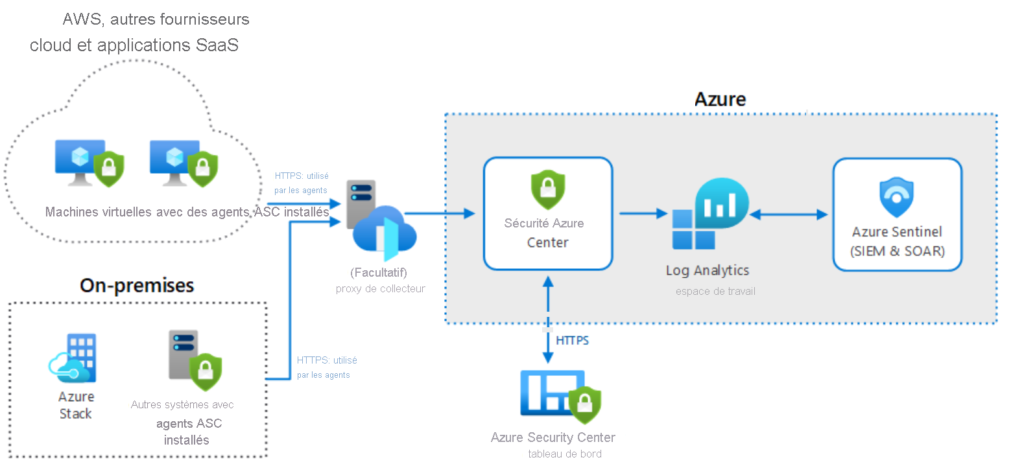 Dans les environnements hybrides, Defender for Cloud peut être intégré à l’agent Log Analytics pour collecter les événements des journaux d’événements, la télémétrie de suivi d’événements et les fichiers de vidage de plantage. Defender for Cloud peut ensuite analyser ces données pour faire des suggestions ou générer des alertes qui peuvent être transmises au système SIEM (Security Information and Event Management) de l’organisation.