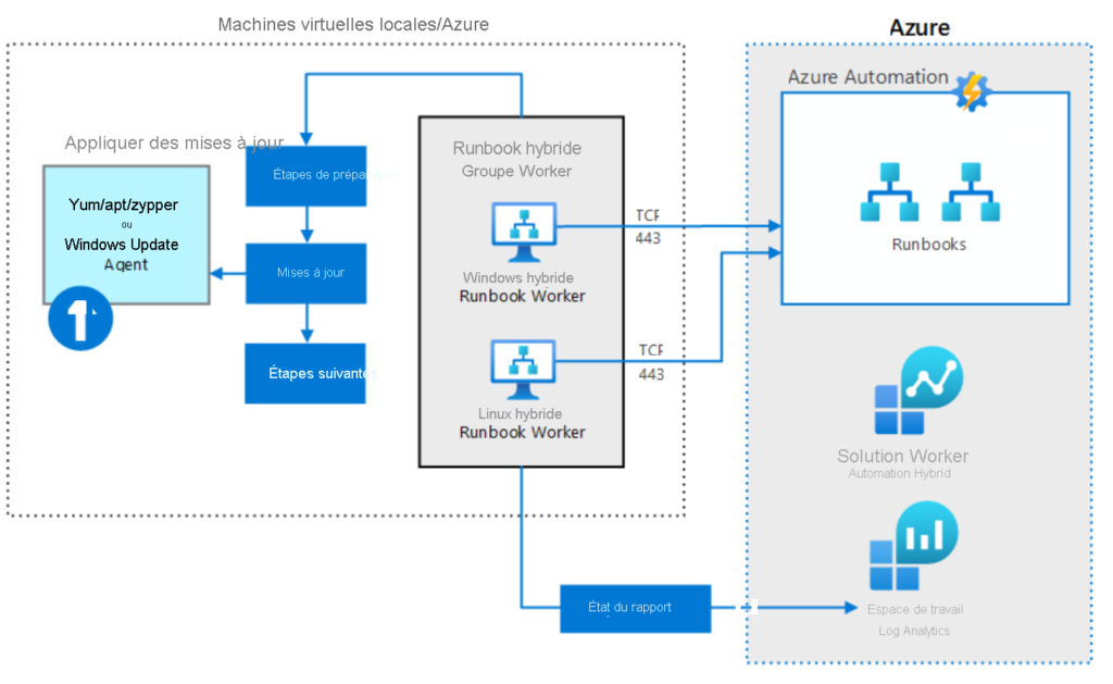Le diagramme suivant montre comment Update Management s’intègre avec Azure Automation et les espaces de travail Log Analytics.