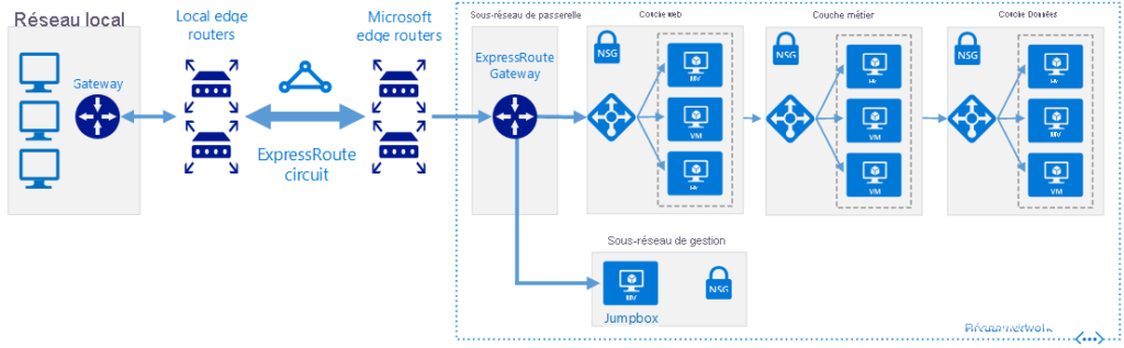 L’image suivante montre la connexion ExpressRoute entre l’environnement sur site et les charges de travail exécutées dans Azure. Le fournisseur ExpressRoute gère le circuit ExpressRoute et les routeurs de périphérie locaux.